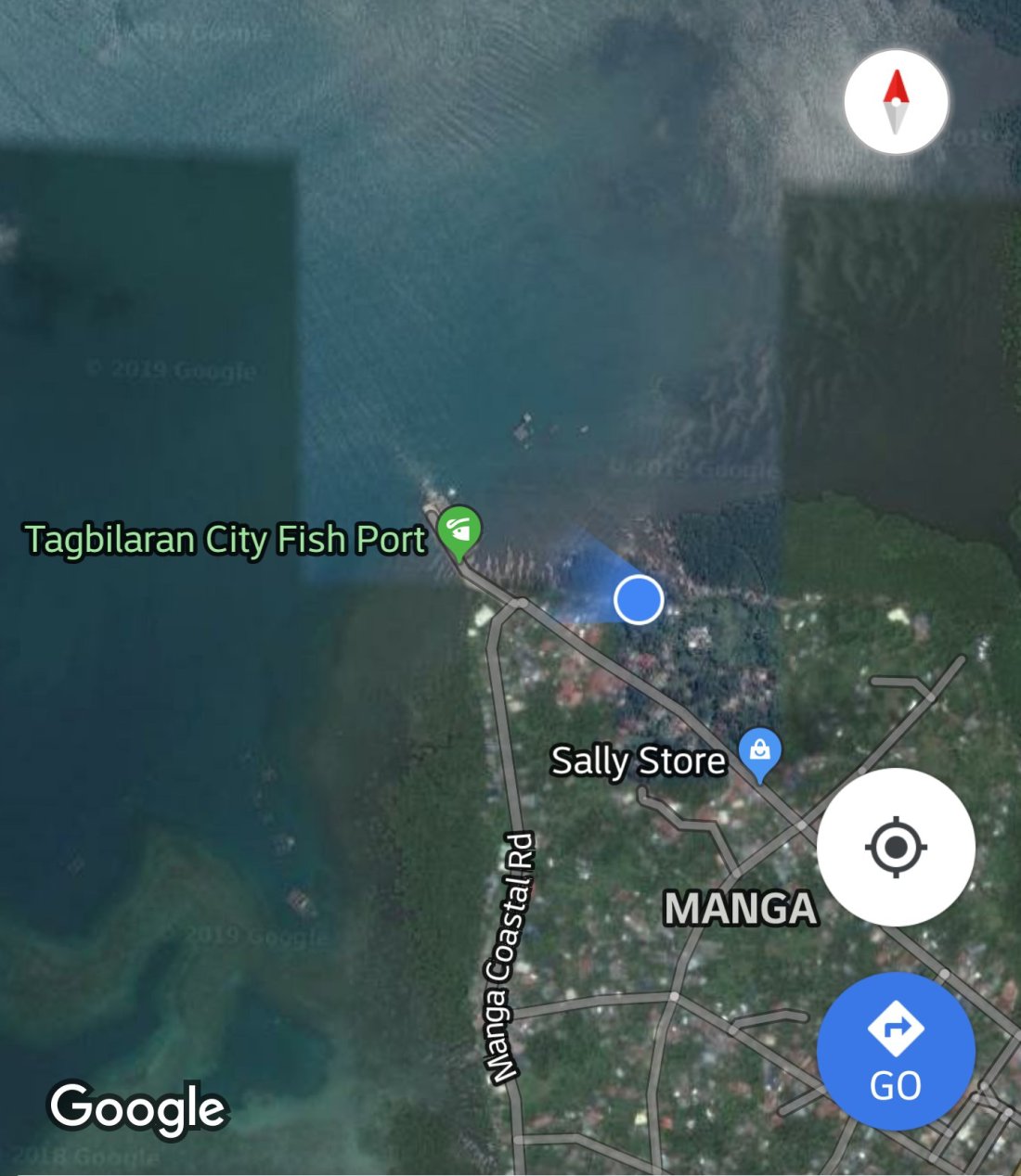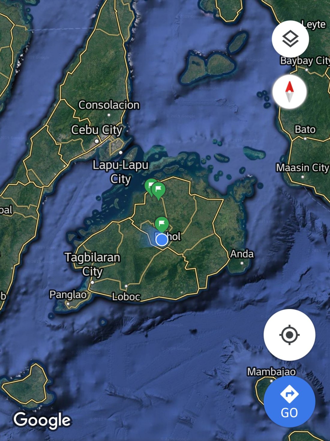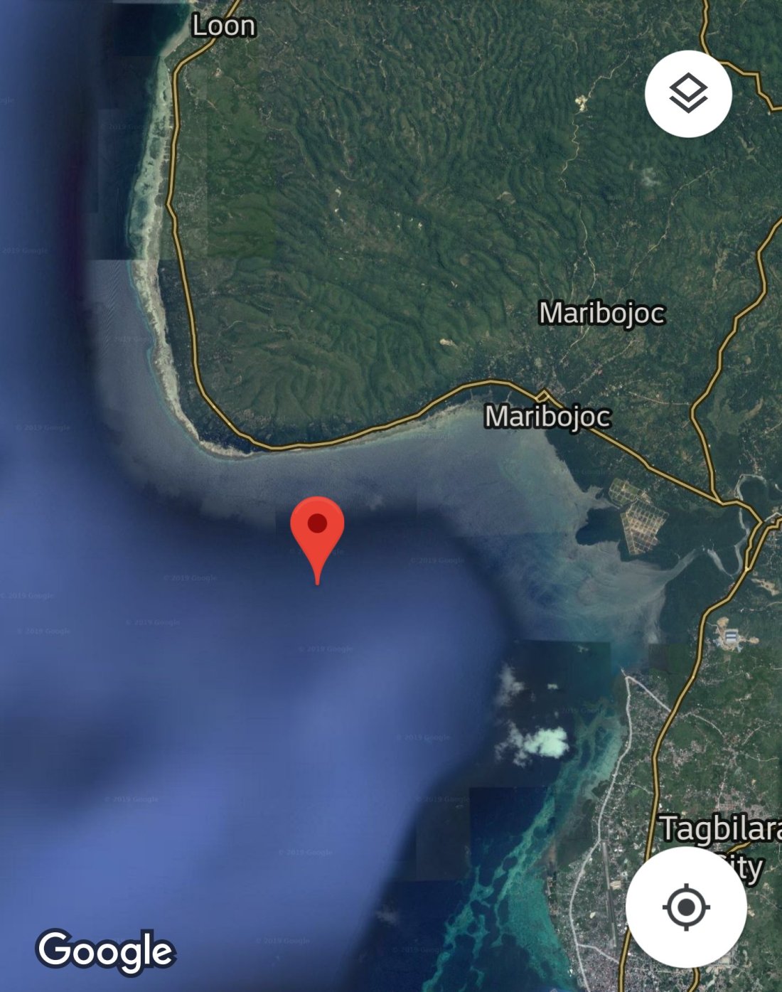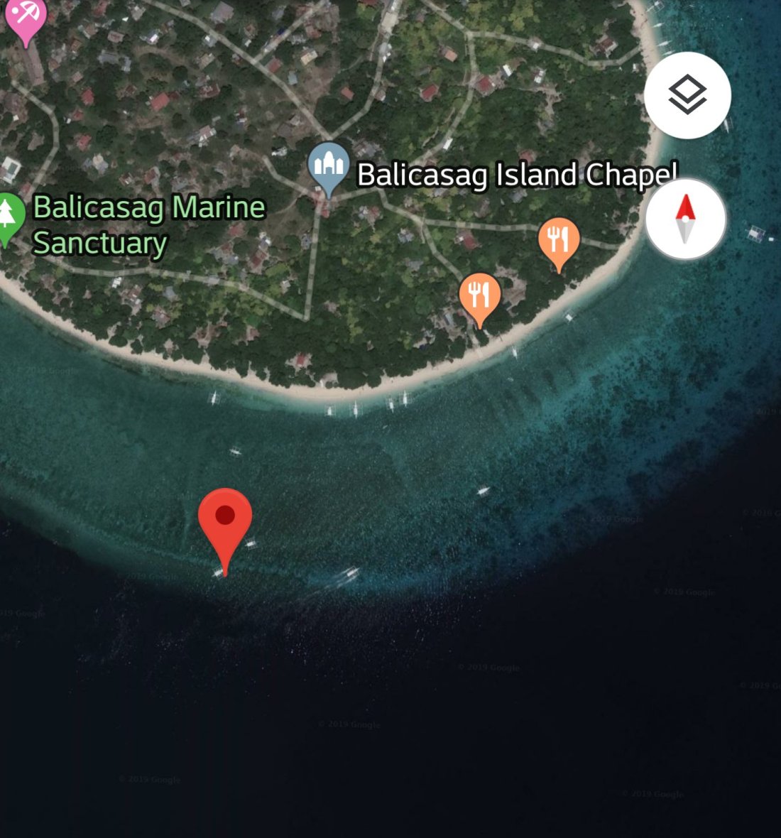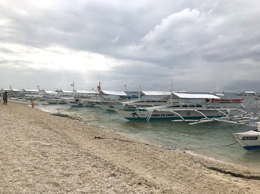This actually look almost identical to when we got there. The big boats from Bohol and Cebu park like this and the little boats that get paddled out for snorkelling go underneath the outriggers. Another guy paddled us out to the reef for snorkelling. We snorkelled about at the pin.