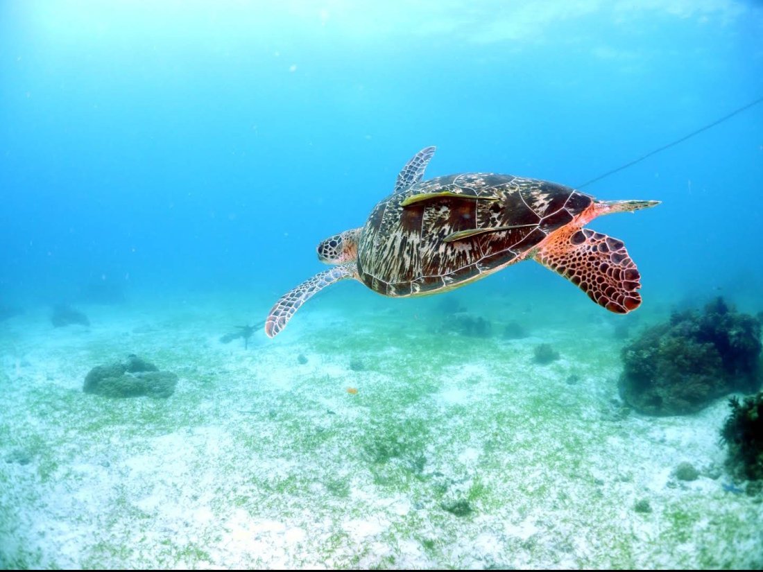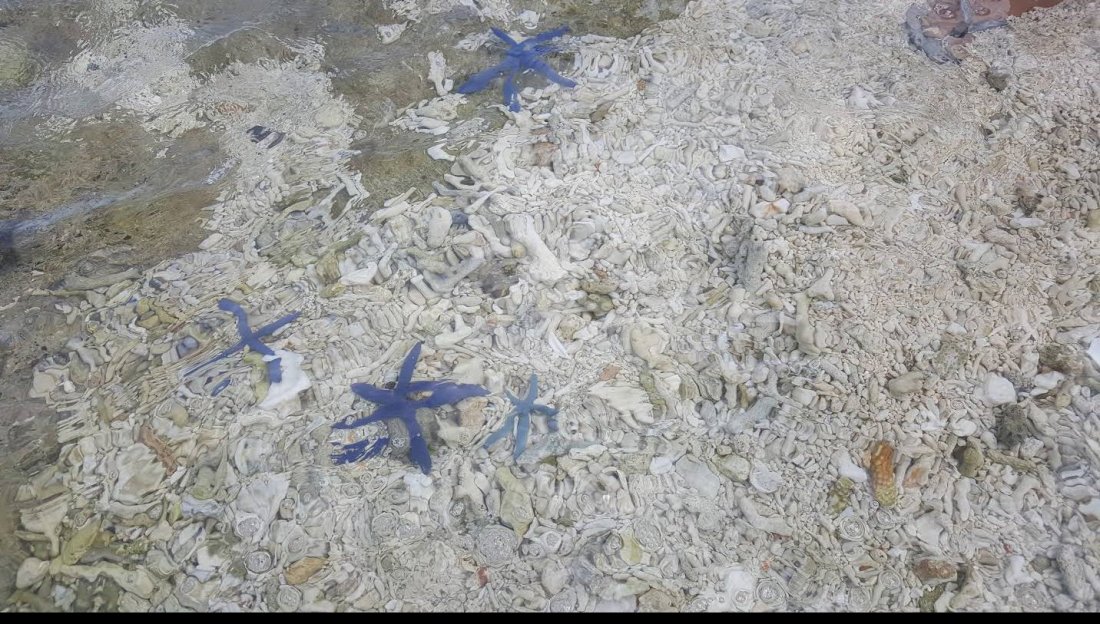 Where you can see the bottom, its shallow, maybe 6 feet deep, but the dark water is deep. Like you can only see darkness below deep. The fish were on the ledge and varied in length from 1 inch to one I saw was probably 2 feet. Also we saw some turtles. They told us to take crackers and if you crumbled them underwater, the small fish would come right up to you to eat. And we saw lots of blue starfish!